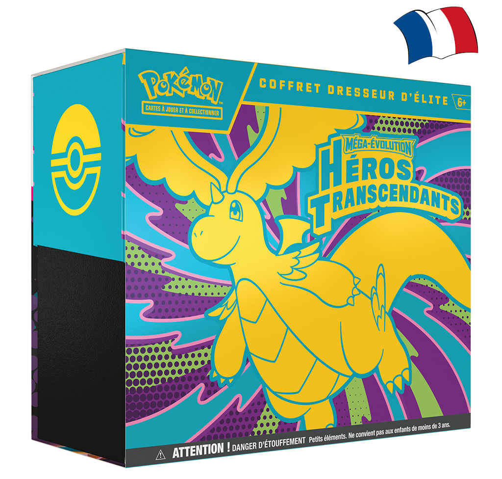 Le coffret contient 9 boosters de la série set de base Méga Évolution Héros Transcendants.